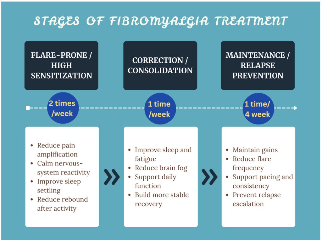 Fibromyalgia often affects more than pain alone. It may also disrupt sleep, energy, concentration, mood, and daily function. At Lotus Care, treatment is structured, stage-based, and adjusted over time to support steadier recovery.